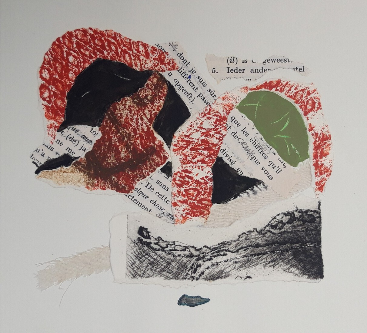 17 x 18 cm, © 2021, prijs op aanvraagTweedimensionaal | Grafiek | Collage collage van tekstfragmenten en monoprints en stof